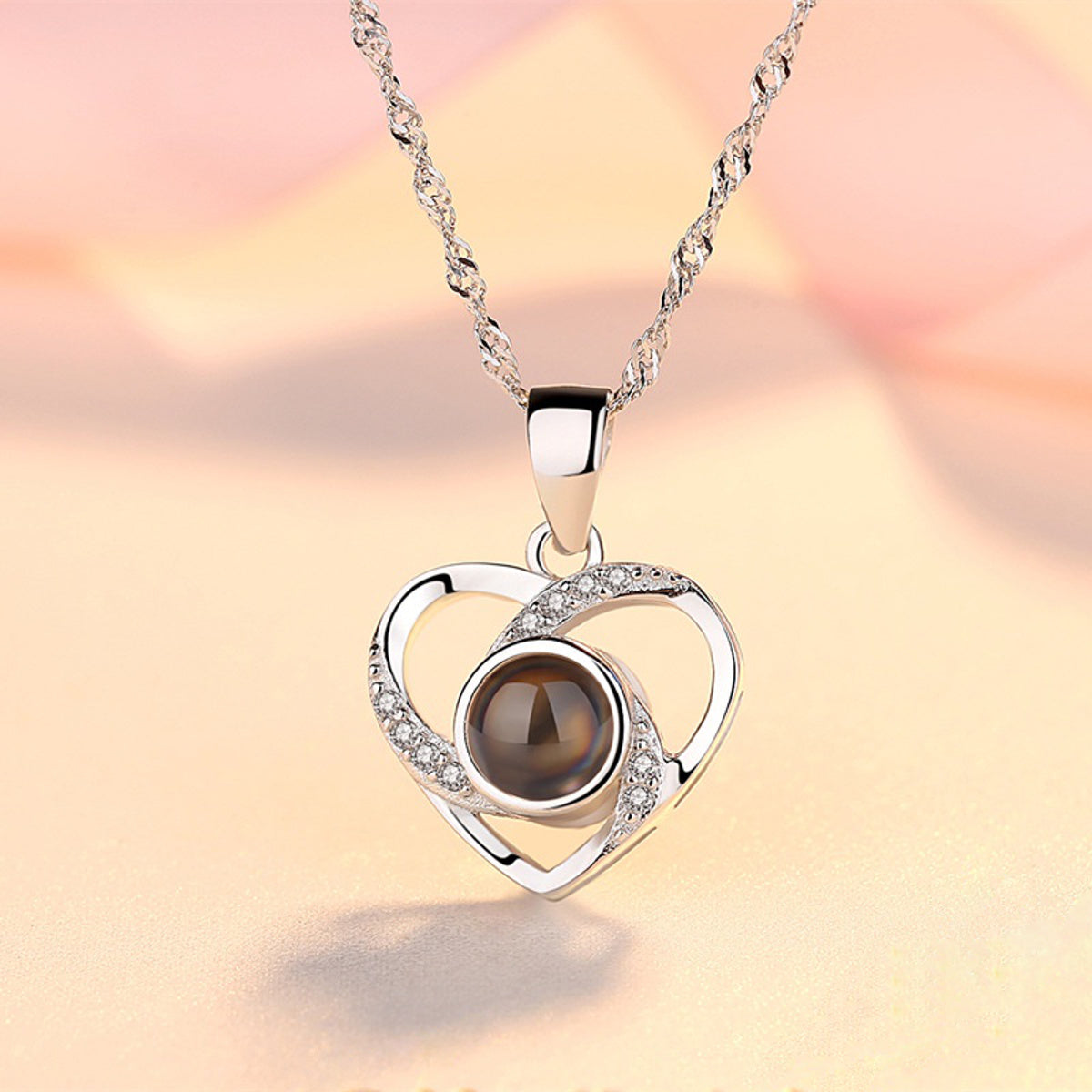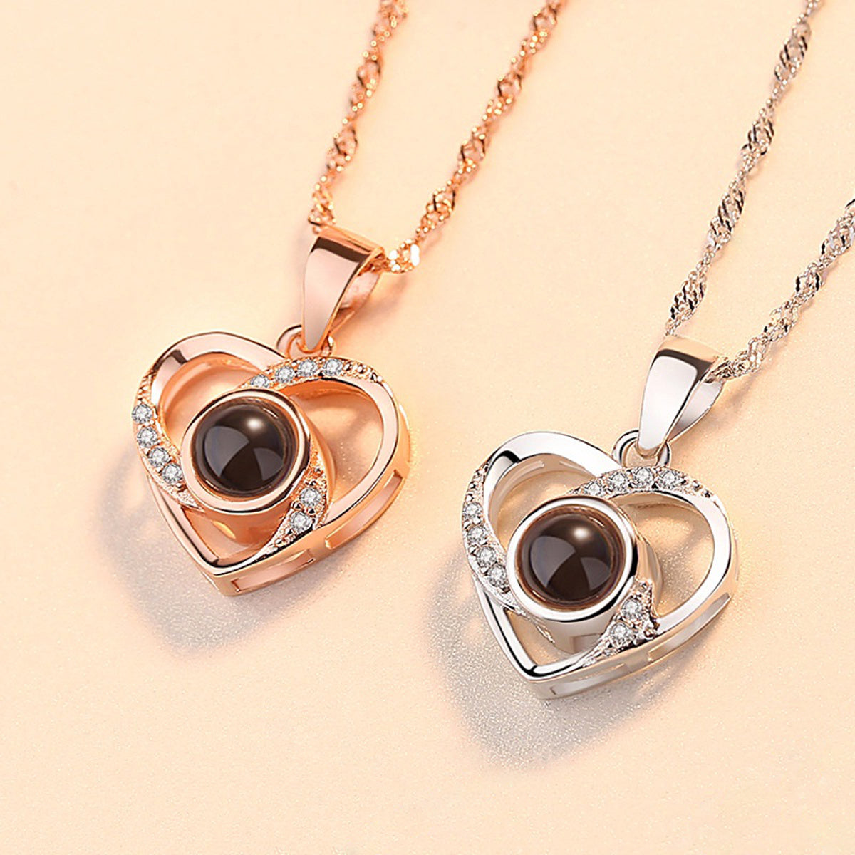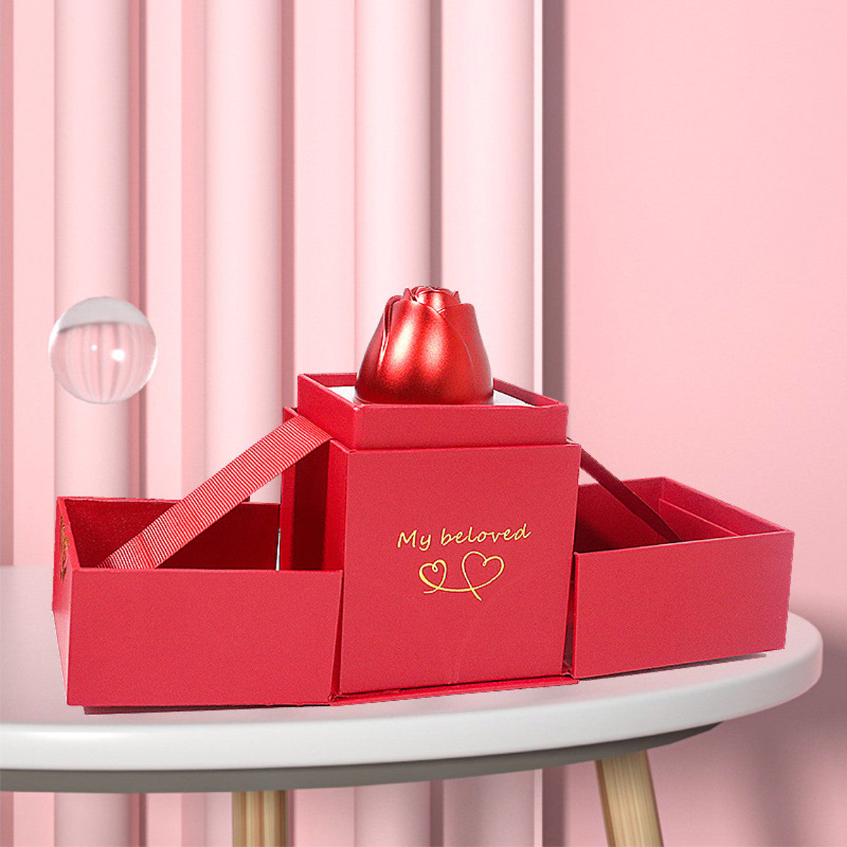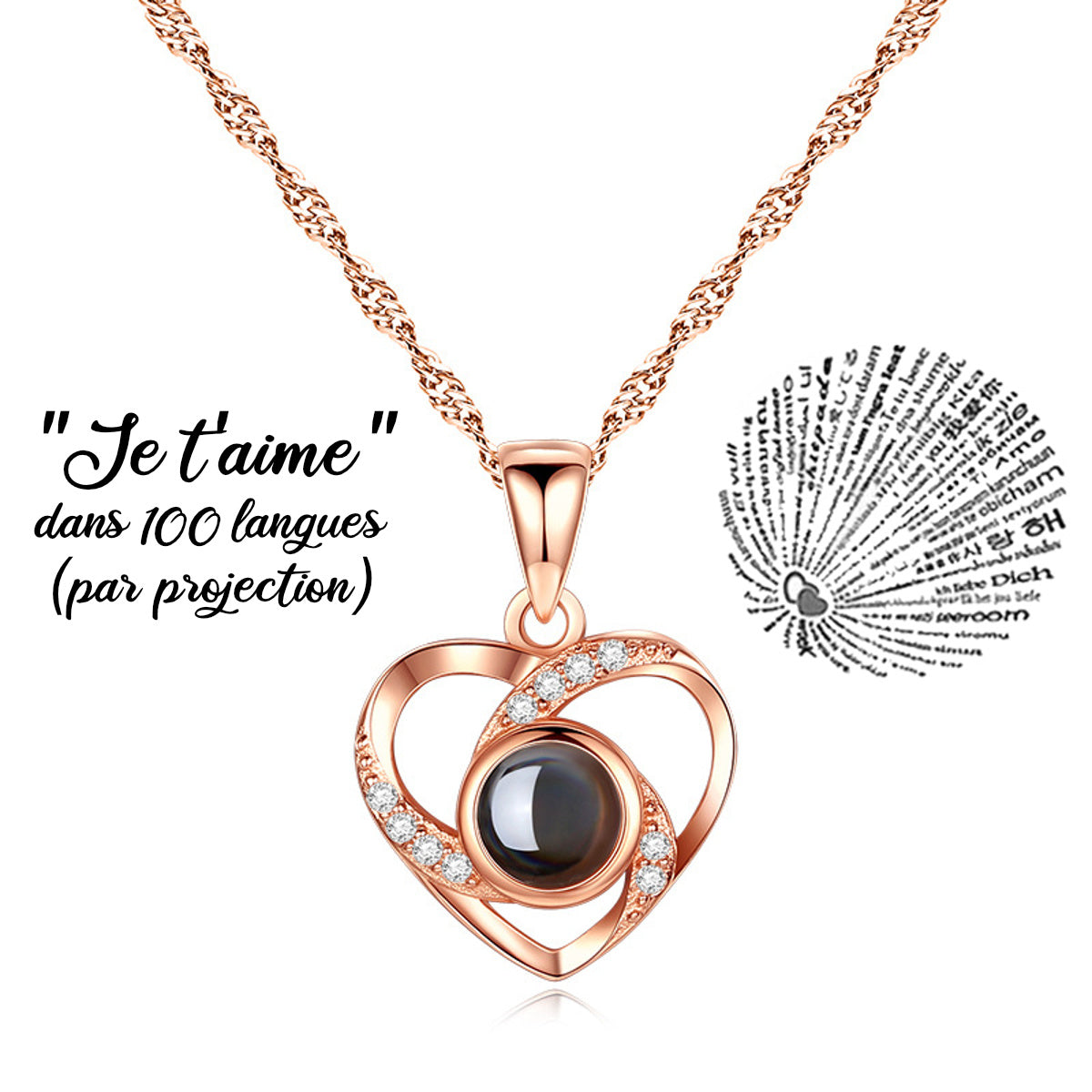 Pour renforcer l’originalité et la rareté de ce coffret, nous avons eu l’idée de cacher la phrase « Je t’aime » dans 100 langues différentes à l’intérieur de ce bijou. En effet, la pierre centrale referme un secret : quand la lumière la traversera, cette phrase magique apparaitra par projection.
