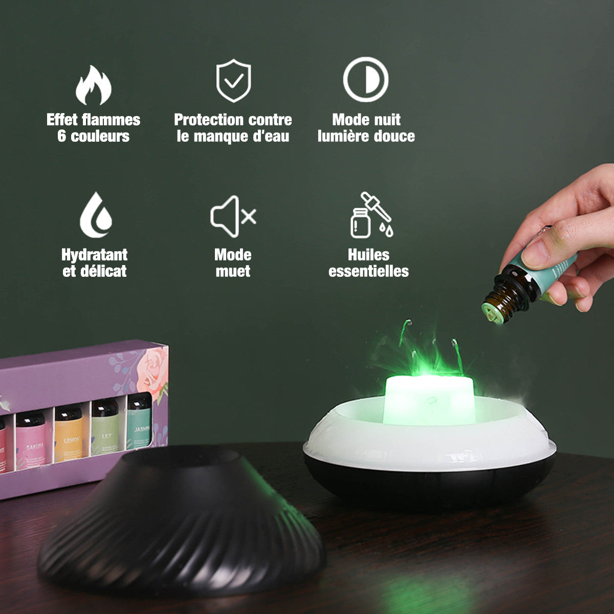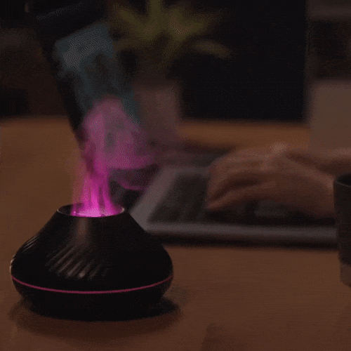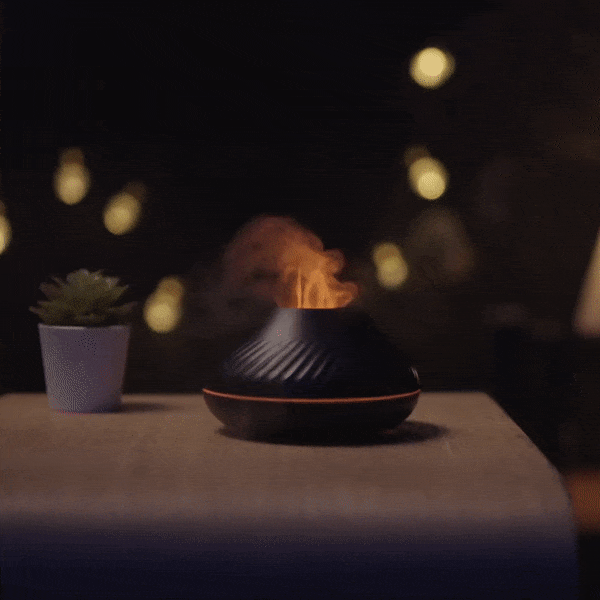 Diffuseur d'huiles essentielles avec effet visuel de flammes artificielles.