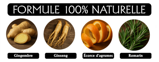 Eau, Ginseng, Gingembre, Écorce d'agrumes, Romarin.