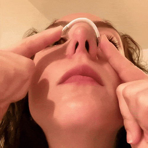 Nettoyer la surface de votre nez à l'eau tiède et séchez bien. Utilisez l'applicateur magnétique pour positionner un patch de chaque côté de votre nez, dans sa partie creuse.