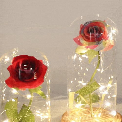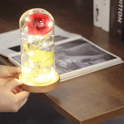 Rose artificielle lumineuse sous cloche en verre. Un cadeau original et symbolique qui marquera la personne aimée à jamais.
